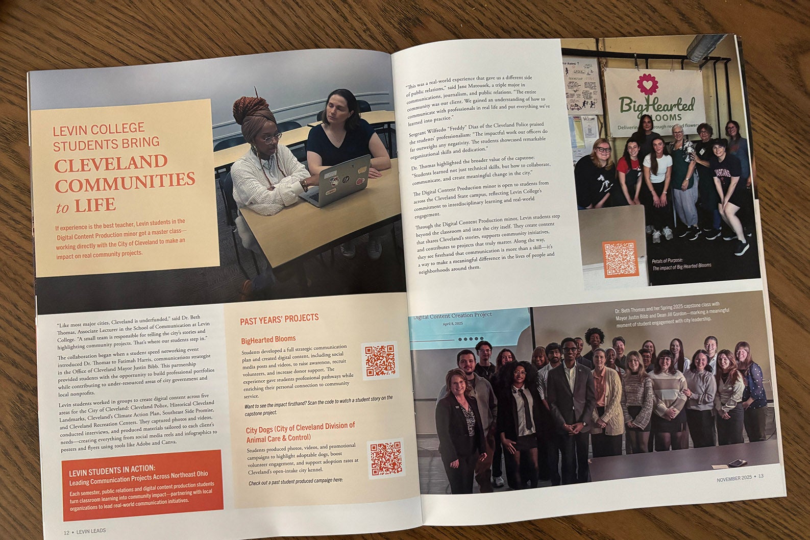 The college also launched in 2024 “Levin Leads,” a multimedia publication that is designed to highlight stories from the college’s students, faculty, and alumni that intersect with the Cleveland diverse communities. The publication recently eleased its second fall edition, highlighting the 20-year impact of PolicyBridge, student-led projects with the City of Cleveland, faculty research and alumni who make a difference in education and public services in Ohio.